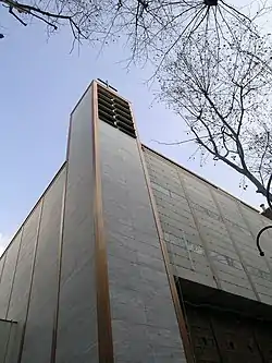 On its southern side, the church fronts directly onto the street. It is entirely clad in semi-translucent white marble. This striking material demarks the religious character of the building and sets it apart from its neighbours. At night, because of the marble's translucence, the church's interior lighting illuminates the street outside.