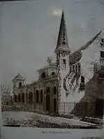 The first stone was placed on 1 October 1664 by the Archbishop of Paris, but work was delayed by a shortage of funds and other mishaps. The architect died soon after the project began, and was replaced by Gabriel Le Duc and then by two more architects in succession. A wind storm in 1701 destroyed the new roof.[4] Due to the long delays, houses were built next to the church, taking the space originally intended for the traditional west front, which had to be relocated. The church was not completed until 14 July 1726, sixty years after the beginning of its construction.[4] The original bell tower was destroyed by a storm in 1740, and was replaced by a new openwork tower, which allowed the strong winds on the island to pass through. Another unusual feature of the tower is the clock, which hangs over the street like a shop sign.[5]