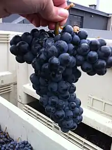 Merlot grapes are identified by their loose bunches of large berries. The color has less of a blue/black hue than Cabernet Sauvignon grapes and with a thinner skin and fewer tannins per unit volume. It normally ripens up to two weeks earlier than Cabernet Sauvignon. Also compared to Cabernet, Merlot grapes tend to have a higher sugar content and lower malic acid.[7] Ampelographer J.M. Boursiquot has noted that Merlot has seemed to inherit some of the best characteristics from its parent varieties—its fertility and easy ripening ability from Magdeleine Noire des Charentes and its color, tannin and flavor phenolic potential from Cabernet Franc.[1]
