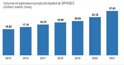 - "Volume of petroleum products traded at the Saint Petersburg International Mercantile Exchange (SPIMEX) in Russia from 2015 to 2021(in million metric tons)". Statista.