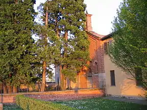 After the suppression of the monastic orders by Napoleon Bonaparte, the farmhouse and church were sold to various landowners.[15] In 1886 the church was restored and some frescoes of the fourteenth century were found. They depict Saint Ambrose among his brothers Satyr and Marcellina with the holy martyrs Sebastian and Pope Fabian.[16]