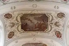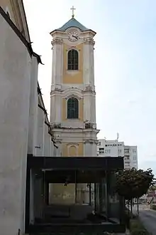 The church suffered from fires on several occasions, the most devastating of which took place on May 21, 1917.[2] The town, not having a pipe system, had been on flames for more than two days by the time water could be transported from the nearby village of Vámosgyörk.[2] By that time the town and also the church had been severely damaged. Nearly 600 houses were burnt down, but only 11 people died.[2] Even the soldiers were allowed from the frontlines of World War I to go home to help rebuild the town.[2] The reconstruction of the church could start in 1920 and ended in 1922. The architects were Nagy Virgil and Wälder Gyula.[3] The inner decoration and the fresques were made by the best of the age, such as Tardos Krenner Viktor and Dudits Andor, whose paintings can also be found in the building of the Parliament.[3] The church was last renovated in 1992 when the walls were entirely repainted.