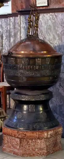 Saint Bartholomew Church (Hungarian: Szent Bertalan Nagytemplom) is in the center of Gyöngyös (northern Hungary) and was built in the 14th century. The locals call it the "Big Church" (Hungarian: Nagytemplom) because it is the town and its vicinity's biggest one. Originally it was built in Gothic style, but today it shows the characteristics of a Baroque Church. One of the curiosities the church has is the bronze font made around the 16th century.[1]