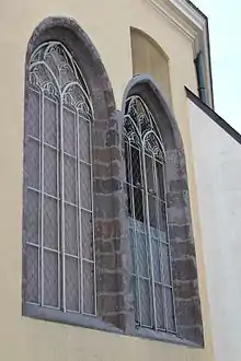 The town was granted the rights of an agricultural town by Charles I of Hungary in 1334 upon the request of the settlement's landlord, Széchenyi Tamás.[2] As the town were growing bigger and bigger, the church had to be enlarged from time to time. During the 15th century it was rebuilt again, and then it was made into a Gothic hall church.[1][3] It used to be the largest Gothic church in Hungary[1] having three aisles (the nave and two side aisles) and twenty winged altars,[3] and today there are two Gothic coupled windows on each side of the apse reminding us to that era.[2]