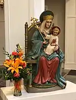 Fr. Walsh was appointed the first pastor of Saint Bede and the College Chapel in 1939. With the 2 February 1942–Feast of the Presentation of Christ in the Temple–dedication of the Saint Bede parish to Our Lady of Walsingham, Fr. Walsh commissioned a statue depicting the Marian apparition done in the same style of that present at the Slipper Chapel, itself based on that from the Walsingham Priory.[10] The dedication of Saint Bede church to Our Lady of Walsingham is possibly attributable to Fr. Walsh's personal devotion to the apparition and visit to Europe in 1934 and possible pilgrimage to Walsingham that year.[8]: 40 In 2016, the United States Conference of Catholic Bishops recognized the Shrine of Our Lady of Walsingham as the first national shrine in the Diocese of Richmond.[30]