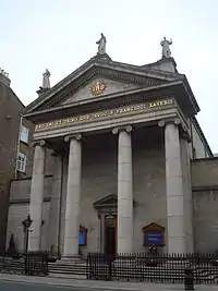 Designed by Father Bartholomew Esmonde SJ and erected by the architect Joseph B. Keane as a Classical cut granite stone essay, the first stone was laid on 2 July 1829, the year of Catholic Emancipation. The church was opened on 3 May 1832, though the parish website says "The High Altar ... was designed and assembled in Rome by Fr. B. Esmonde ... who with Mr John B. Keane was the architect of the church". Architectural critic Christine Casey describes it in her book, Dublin, as "the most elegant church of the period in Dublin".[1] The building is known for its collection, sculpted altar piece, and paintings, mostly Italian in origin and dating from the Victorian period. The design of St Francis Xavier Church reflects Father B. Esmonde's knowledge of the temples of Italy acquired during his residency there.[2]