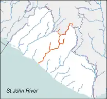 The river's drainage basin covers 14,762 square kilometres (5,700 sq mi) over both Liberia and Guinea.[3] At 175 miles (282 km) in length, it is one of the six main or major rivers of Liberia.[1][3] There are only 16 rivers in the country total.[4] The average annual discharge of the St. John is 136.06 m3/s (4,805 cu ft/s) as measured at the inland station of Baila.[5] During the wet season in October, flows average 233.49 m3/s (8,246 cu ft/s), while in February during the dry season the flows average 18.95 m3/s (669 cu ft/s) at the same location.[5]
