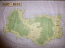 In episode 4.5, it is mentioned that Martinique is "a good 70 miles." In Episode 5.2 a map can be seen with Puerto Rico in the northwest and Dominica in the southeast of the map, Saint Marie, in addition to another fictional island, Saint Robert, are present on the map, it would appear that there is significantly more distance between Guadelope and Dominica in the Death in Paradise universe, Saint Robert appears similar in shape, and slightly smaller in size than Dominica, although rotated by about 100-110 degrees anti-clockwise; although inconsistent with other in-universe statements Saint Marie appears about the same size as Dominica, and much larger than Marie-Galante. Marie-Galante, Saint-Marie, Spinner's Rock (a small islet relevant to this episode), and Saint Robert can be described as being on a straight line between Guadelope and Dominica in that order from the most northern to the most southern. Both Marie-Galante and Dominica are present, thus ruling out the possibilities of these two as candidates for Saint-Marie.