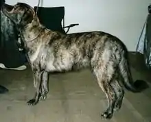 The breed is large but not over-sized; up to a maximum of 60 cm (23.6 ins) at the withers and 35 kg (77 lbs) in weight, with females slightly smaller. The general appearance is of a normally proportioned, deep chested, muscular dog with a broad head and medium length neck, straight back, and long legs. The tail is held up and is slightly curved. The breed has drop ears, unless they are cropped. The coat is a brindle of brown (pale brown is described as fawn) or grey, with black; it is short, smooth and harsh to the touch, with a short fringe on the tail (if undocked) and on the backs of the rear legs.