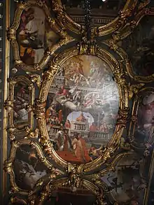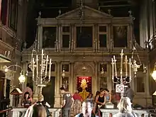 The front of the marble iconostasis resembles the exterior of the entrance of a baroque-style church. The ceiling of the church is divided into segments depicting scenes from St. Spyridon's life and miracles. The original painter of the church ceiling was Panagiotis Doxaras who created the works in 1727. With the passage of time the Doxaras paintings rotted away and subsequently they were replaced by copies painted by Nikolaos Aspiotis, a member of the Aspiotis family of Corfu.[2] The only remaining trace of Doxaras's work is the gilded border of the iconography.[4][5]