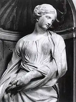The Saint Susanna is a marble sculpture by François Duquesnoy. The work is one of four sculptures of Roman virgin martyrs commissioned by the Bakers' Guild to decorate the church of Santa Maria di Loreto in Rome. It was completed in the course of four years from 1629 to 1633. Giovanni Pietro Bellori, comparing Duquesnoy's achievement with the Saint Susanna to that of Polyclitus with his Doryphoros and its Kanon, commented [Duquesnoy has] left to modern sculptors the example for statues of clothed figures, making him more than the equal of the best ancient sculptor.[1][2] The statue is considered by modern scholars an exemplification of Duquesnoy's 'Greek ideal,' which included an approach to drapery unpopular at the time, established through the study of antique models selected by Duquesnoy.[2]