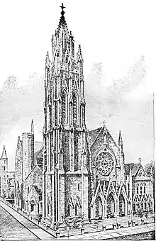 A third church was built from 1865 to 1870 at the corner of 53rd Street and Fifth Avenue based upon a design by Richard Upjohn and his son Richard Michell Upjohn.[9] The cornerstone for the new church was laid on October 14, 1868.[11][5][12] Two years later, on October 6, 1870, the congregation moved into its new home.[11][5] This structure, in a neighborhood at the time dominated by the mansions of Manhattan's upper class, featured a prominent 260-foot (79 m) high tower and a bas-relief reredos by Augustus Saint-Gaudens and murals by John LaFarge.[9][13] Though the new Saint Thomas's was a parish church, its location and design evoked that of a cathedral.[14]
