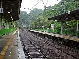 The station was consists of two opposed side platforms. The station is built on the side of a hill, with the platforms at a higher elevation than the station building.