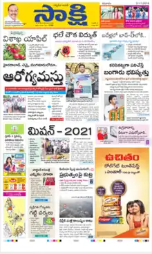 Sakshi (transl. The Witness)[2] is an Indian Telugu language daily newspaper sold mostly in the states of Andhra Pradesh and Telangana. It was launched on 23 March 2008 by Jagati Publications Ltd. owned by Y. S. Jagan Mohan Reddy.[3][4][5]