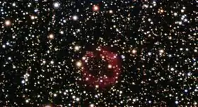 Sakurai's Object is surrounded by a planetary nebula created following the star's red giant phase around 8300 years ago.[26] It has been determined that the nebula has a diameter of 44 arcseconds and expansion velocity of roughly 32 km/s.[27]