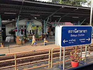 Salaya railway station is a railway station located in Salaya Subdistrict, Phutthamonthon District, Nakhon Pathom Province and is a class 1 railway station. It is located 19.081 kilometres (11.9 mi) from Thonburi railway station. Salaya railway station is close to Mahidol University and Mahidol Witthayanusorn School and therefore the station also serves these two institutes.