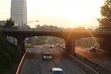 On January 6, 1958, the first 1.2-mile-long (1.9 km) section of the East–West Expressway was opened, connecting between Cloverdale Avenue and Main Street.[10][11] Because of the novelty, local newspapers ran a series of stories and diagrams on how to use the expressway, educating the public on how on-ramps and off-ramps work.[8] Designated as I-40, the expressway soon ran concurrently with US 158 in 1959, from Stratford Road to Marshall (westbound) and Cherry (eastbound) streets.[12] In 1960, the expressway was extended west into Yadkin County, at NC 801, and east to Reidsville Road.[13] In 1961, US 421 was rerouted from Pfafftown and downtown Winston-Salem onto new freeway that connected directly with the expressway, then continued easterly running concurrently with I-40.[14] In 1962, US 158 was realigned to continue along the expressway to Reidsville Road, its former alignment became US 158 Business (decommissioned in 1970). East of Reidsville Road, I-40/US 421 was extended onto new freeway to Kernersville, where it then linked with second built section of I-40 (late 1958) and continued towards Greensboro.[15]