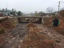 First phase of construction was focused on and around Peters Creek Parkway (NC 150), which included lowering the freeway to establish a minimum vertical clearance of 17 feet (5.2 m) at the new Fourth Street two-lane bridge and 17.5 feet (5.3 m) at the new seven-lane Peters Creek Parkway bridge. After two years of intermittent closures, the new Peters Creek Parkway bridge was opened on November 12, 2018.[34][35] On November 17, the second phase began with the complete shutdown of Business 40 between Peters Creek Parkway and John Gold Memorial Expressway (US 52/US 311/NC 8); three alternate routes were set up through the downtown area for locals while travelers are encouraged to remain on mainline I-40.[36]