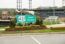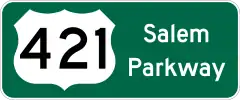 NCDOT had also decided that once construction was completed, that I-40 Business would be decommissioned and a new name would be given to the freeway alongside the existing US 421 designation. The rationale was the continued confusion locals and travelers have between I-40 and I-40 Business. In November 2015, the residents of Winston-Salem metro area were allowed to submit a nomination for a new name, with a January 30, 2016, deadline. A selection committee, which included appointments from Winston-Salem and Kernersville, whittled the list to just four for another public vote.[31] The eventual four finalist names were: Golden Leaf Parkway, alluding to the region's tobacco-growing and processing heritage; Innovation Highway, showing the high-tech aspirations of the area; Piedmont Corridor, identifying geographic location in a highly developed part of the state, and Salem Parkway, which refers to the Moravian settlement founded in 1766.[32] On October 21, 2016, Governor Pat McCrory announced, at the project's ground breaking event, the new name of the freeway as the Salem Parkway; which was the overwhelming favorite, receiving 53% of the vote.[33] This name change took place when the highway reopened on February 2, 2020,[4][5] though new signs will show the Salem Parkway name once they are installed.[7]