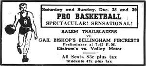 On December 22, 1946, the Bellingham Fircrests sold guard Don Stitt to Salem.[1] In January 1947, the Trailblazers only played one game in Salem and by February they abandoned the city as their home and became a traveling team. Low attendance was cited as the reason for the change.[2][3] Len Yandle was the head coach of the team until he was replaced by Frank Shone, who eventually resigned the position. The team finished their home games in Mt. Angel, Oregon at the Mount Angel Abbey.[4] The Trailblazers were owned by Dan Hay who struggled throughout the season to pay investors and outstanding bills. After the season, he merged his team with the Spokane team, becoming the Spokane Blazers.[5] The team folded three weeks after the merger.[6]
