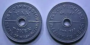 Sales tax tokens are fractional cent devices that were used to pay sales tax on very small purchases in many American states during the years of the Great Depression. They were created as a means for consumers to avoid being "overcharged" by having to pay a full penny tax on purchases of 5 or 10 cents. Issued by private firms, by municipalities, and by twelve state governments, sales tax tokens were generally issued in multiples of 1 mill (1⁄10 cent).[1]