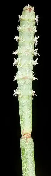 Beaded glasswort, Salicornia quinqueflora, is a species of succulent, salt tolerant plant. It grows as a small shrub, with a lifecycle of several years – which is also known as a perennial lifecycle. They are normally found near salt water bodies (along the coast or estuaries) and grow in a mat form along the ground.[5] The stems are jointed and fleshy when young, but they dry out and appear woody when ageing.[6] The young, fleshy stems are grey or green with sometimes red colouring along the tips.[7] The leaves grow opposite to each other and are connected at the base. They grow on small bumpy petioles – which is the part of a stalk that attaches the leaf to the stem. The leaves then extend down the stem – which in turn, forms the noticeable joints. The leaves look like tiny blades, wrapped around the stem.[6] This formation of the leaves gives the stems a ‘beaded’ look. Growing at the end of the stem, the inflorescences (another name for clusters of flowers) are spikey, and made up of small segments with largecymes. Cymes are a group of flowers with a central stem that matures before the others. Each cyme usually has three flowers entirely immersed in the fleshy part of the joint.[6] The unisex or bisexual flowers are nearly always identical in size and grow in an outwardly symmetrical style along the stems. The flowers have three to four fleshy exterior parts that connect to the apex (highest part of the stem), one or two stamens (the pollen-producing reproductive organ) and an ovary with two or three parts that hold the pollen (the stigma).[6] There is a lot of fruit found in the outer part of the flower, and the fruit wall has a membrane. The seeds are vertical and spherical in shape, light brown, hairy and also have a membrane on the exterior. The hairs take on many forms – they can be angular, slight, curved, conic or straight. There is no feeding tissue (also known as the perisperm) within the seed.[6]