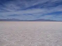 The Salinas Grandes are located in the north in the provinces of Jujuy and Salta (in Argentina), at an average altitude of 3,450 meters (11,320 feet) above sea level. It covers an area of 212 km2 (82 sq mi) and is well-known for its vast white desert.[1] The desert is about 320 km (200 mi) wide.