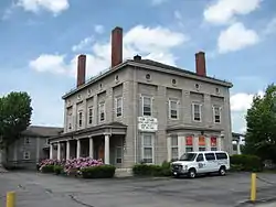 The Greek Revival building was constructed between 1836 and 1838 by Stephen Salisbury II, son of Worcester merchant Stephen Salisbury I whose 18th century mansion stands nearby. It was added to the National Register of Historic Places in 1975.[2] The two-story wood-frame structure is finished in flushboarded wood treated to resemble stone. Design of the building is attributed either to Elias Carter or Isaiah Rogers (sources disagree).[3]