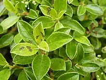 - Leaves usually ovate up to 5 cm long by 3 cm wide; hairless and bright green on upper side; at first densely hairy on lower side, then hairless; margins with numerous small blunt teeth.
