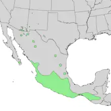 Besides the core range area, (of the northern Sierra Madre Occidentals) in Arizona–New Mexico and northeast Sonora,[3] two larger disjunct regions occur in west Texas and central Chihuahua.[3] South of Chihuahua, Chihuahua it is found at the Conchos River, and west of the city, a large area at the lake region. It also occurs in scattered, isolated locales of Durango, Sinaloa, and in the northeast at Nuevo Leon and Tamaulipas: also extreme southern Baja California Sur, (west of Sinaloa-Durango across the Gulf of California).[3] Besides parts of the Sierra Madre Occidental, locales occur in the southern Sierra Madre Oriental cordillera, but also small isolated locales as far northeast as the northeast states.