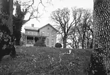 Bush House from Mission Street, with oak trees, wildflowers, and cat. By Sally Bush, using glass plate negative process.