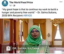 Salma Sultana is a veterinarian, entrepreneur, and researcher.[1] She is the recipient of the 2020 The Norman E. Borlaug Award for field research and application.[2] She has also been honored by World Food Prize Foundation. Sultana has received this award for her innovative model of providing veterinary outreach, treatment, and education to thousands of small-scale farmers in Bangladesh.[3]