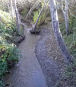Salmon Creek originates about 2 miles (3 km) west of the town of Occidental near the junction of Joy Road and Bittner Road.[1] It parallels Bittner Road eastward, passing just south of Occidental, where it turns right and follows Bohemian Highway to the town of Freestone. From there, it curves south and then west, passing Watson School historic park as it parallels Bodega Highway to a confluence with Nolan Creek just east of the town of Bodega. It flows through Bodega, then follows Salmon Creek Road westward into a narrow canyon, where it is joined by Tannery Creek, Fay Creek, Coleman Valley Creek, and Finley Creek. Salmon Creek emerges from the canyon between Irish Hill and Coleman Hill and crosses State Route 1 at milepost 12.49, entering Sonoma Coast State Beach south of the ranger station. It parallels Bean Avenue to Salmon Creek Beach, which it bisects as it enters the Pacific Ocean.