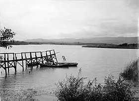 ![]() Man on a boat near a dock in College Lake (originally Laguna Grande) just east of Watsonville, California, circa 1900, courtesy of University of Southern California. Libraries and California Historical Society | |
