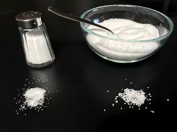 Comparison of table salt with kitchen salt. Shows a typical salt shaker and salt bowl with salt spread before each on a black background.