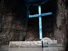 The Salt Cathedral of Zipaquirá (Spanish: Catedral de Sal de Zipaquirá) is an underground Roman Catholic church built within the tunnels of a salt mine 200 metres (660 ft) underground in a halite mountain near the city of Zipaquirá, in Cundinamarca, Colombia. It is a tourist destination and place of pilgrimage in the country.[2] The temple at the bottom has three sections, representing the birth, life, and death of Jesus. The icons, ornaments and architectural details are hand carved in the halite rock. Some marble sculptures are included. The cathedral is considered one of the most notable achievements of Colombian architecture,[3] being described as a "Jewel of Modern Architecture".[4] The cathedral represents a valuable cultural, environmental and religious patrimony for the Colombian people.[5]