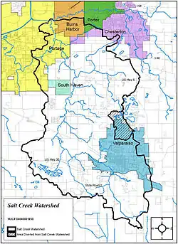 The Salt Creek watershed covers 19% of Porter County and 49,573 acres (20,061 ha), including the communities of Valparaiso, South Haven, Portage and Burns Harbor, Indiana.[4]