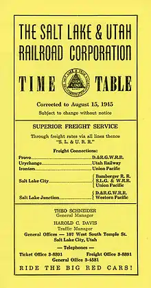 The Salt Lake and Utah Railroad, also known as the Orem Line or Orem Interurban, was an electric railroad which operated between downtown Salt Lake City and Payson, Utah, United States. Construction of the main line was started in 1913 with financing provided by A. J. Orem & Company, with Walter C. Orem as president.[1] The railroad opened in 1914 with stops in both Utah and Salt Lake counties.[2] The railroad also operated a branch line which ran to Magna. Both passenger and freight service was offered. The line's terminus in downtown Salt Lake City was shared with the Bamberger Railroad, and was located at the current site of Abravanel Hall. The railroad stopped service in 1946.