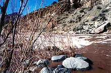 The Salt River (Spanish: Río Salado, O'odham [Pima]: Onk Akimel, Yavapai: Hakanyacha or Hakathi:, Maricopa language: Va Shly’ay[5]) is a river in Gila and Maricopa counties in Arizona, United States, that is the largest tributary of the Gila River.[2] The river is about 200 miles (320 km) long.[6] Its drainage basin is about 13,700 square miles (35,000 km2) large.[3] The longest of the Salt River's many tributaries is the 195-mile (314 km) Verde River. The Salt's headwaters tributaries, the Black River and East Fork, increase the river's total length to about 300 miles (480 km). The name Salt River comes from the fact that the river flows over large salt deposits shortly after the merging of the White and Black Rivers.[7][8]