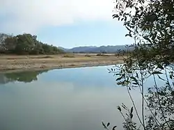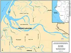 Historical land reclamation activities for agriculture, including tide gates and levees as well as siltation from uphill landslides and erosion, slowly filled in the river over time, reducing the watershed by 42 percent.[9] Most of the original vegetation and trees were gone by 1900, leading to an increase in siltation and a shallowing of the river. In the ten years spanning 1889 to 1899, the river depth changed from 20 feet (6.1 m) to 2 feet (0.61 m).[8]: 1 Logging in the Wildcat hills continued and intensified following World War II, leading to construction of logging roads and exposed slopes, producing additional siltation.[6] Siltation continued; by 1949, the Salt River had become so shallow that "at low tide... parts of it can be waded across by a man with hip boots."[7] After the catastrophic 1964 flood, nearly 13,000 acres (5,300 ha) had been covered by sand or silt.[6] In 1967, residents built a levee cutting off the flow of water from the Eel into the Salt,[6]: 17 which prevents the Eel River from spilling over into the Salt channel during high water, and facilitating sediment removal.[5] Without the occasional overflow from the Eel, plus the 1964 sediments, and the addition of landslide sediments from the 1992 Cape Mendocino earthquakes,[6] by 2008 the river had become mostly dry land.[7] During the 1970s, the California Department of Fish and Game stopped farmers from clearing local channels; willows and brush quickly filled in the riverbed,[6] and caught sediment, stopping nearly all the flow in the lower half of the Salt, leading to flooding, problems with dilution ratios at the Ferndale Water Treatment Plant, and water quality in general.[9]