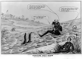 In the period of the 1848 election campaign, political cartoonists employed visual and textual references of Salt River as a means of satire to sway public opinion on the strengths and weaknesses of opposing political candidates. Salt River was described in context as a "tantalizing, semi-mythical waterway whose treacherous shoals were synonymous with ruination of great leaders and their parties."[3] In Hutter’s "Ho for Salt River!", she brings up how backdrops of Salt River were used more than to just symbolise political defeat; Salt River was also a metaphor for the massive political barriers candidates faced towards their opposition and the hardships they encountered.