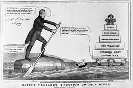 - In the pro-Whig cartoon "Matty's perilous situation up Salt River", Martin van Buren is depicted neck deep in Salt River with weighted boxes of 'Tariff', 'Hooe's Trial', 'Negro Suffrage', 'Sub Treasury', and 'Standing Army of 200,000 men', as well as a crown atop these boxes. Whig candidate William Henry Harrison paddles towards him and watches as he struggles to stay afloat on Salt River.[10]