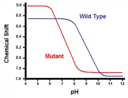 The second method utilizes nuclear magnetic resonance spectroscopy to calculate the free energy of the salt bridge. A titration is performed, while recording the chemical shift corresponding to the protons of the carbon adjacent to the carboxylate or ammonium group. The midpoint of the titration curve corresponds to the pKa, or the pH where the ratio of protonated: deprotonated molecules is 1:1. Continuing with the T4 lysozyme example, a titration curve is obtained through observation of a shift in the C2 proton of histidine 31 (Figure 5). Figure 5 shows the shift in the titration curve between the wild-type and the mutant in which Asp70 is Asn. The salt bridge formed is between the deprotonated Asp70 and protonated His31. This interaction causes the shift seen in His31’s pKa. In the unfolded wild-type protein, where the salt bridge is absent, His31 is reported to have a pKa of 6.8 in H2O buffers of moderate ionic strength. Figure 5 shows a pKa of the wild-type of 9.05. This difference in pKa is supported by the His31’s interaction with Asp70. To maintain the salt bridge, His31 will attempt to keep its proton as long as possible. When the salt bridge is disrupted, like in the mutant D70N, the pKa shifts back to a value of 6.9, much closer to that of His31 in the unfolded state.
