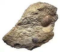 A Rhynchonellatan, member of the family Wellerellidae inside Rhynchonellida. Identified originally as "Rhynchonella variabilis". |