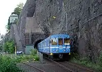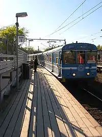 Saltsjöbanan is an electrified suburban rail system between Stockholm and Saltsjöbaden in Nacka, Sweden. It is 18.5 kilometres (11.5 mi) in length and has eighteen stations in use. An average of 17,200 boardings are made on an ordinary workday (2019).[2] The line is mostly single-track (with passing loops between Nacka and Saltsjö-Järla, and between Storängen and Saltsjö-Duvnäs), and is isolated from Sweden's national railway network, although both are built to compatible 1,435 mm (4 ft 8+1⁄2 in) standard gauge. The Storstockholms Lokaltrafik (SL) classifies it as "light rail" in its maps.[3]