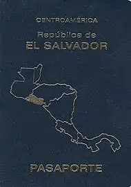 Like all Central American passports the cover is navy with gold fonts stating the official name of the country in Spanish and in English. A map of Central America is displayed with the Salvadoran territory shaded.