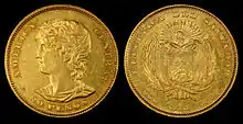 The first decimal Salvadoran coins were issued in 1889. These were copper-nickel 1 and 3 centavos.[1] On August 28, 1892, the Salvadoran mint was established and production of silver and gold coins denominated in centavos and pesos began. In addition to copper 1 centavo coins, there were silver 5, 10, 20 and centavos and 1 peso, and gold 2+1⁄2, 5, 10 and 20 pesos,[2] although the gold coins were only issued in very small numbers (597, 558, 321, and 300 respectively.[2] In 1909, bronze 1⁄4 real coins were issued in response to the continued use of the real currency system in parts of the country. Coins for 25 centavos were introduced in 1911. Production of silver coins was suspended in 1914.