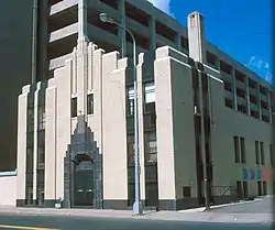 The Salvation Army Headquarters was a 2+1⁄2-story, three-bay structure in the Zigzag Moderne phase of Art Deco architecture. The symmetrical facade incorporated the clean lines, geometric patterns and decorative motifs that characterized that particular phase of the Art Deco style. These included setback and stepped patterning, contrasting light and dark colored building materials and an overall vertical orientation. The walls used a cream-colored pressed brick that contrasted with brownish-gray tiles. The vertically aligned windows were set in black metal window frames and divided by black metal spandrels. The dominant feature was the centrally located entrance, which was highlighted by extending the central bay up above the roofline and surrounding the entrance with tile in a step pattern that created a ziggurat effect typical with the style. At the top, the entire wall stepped back to enhance the geometric patterning of the design. A cornerstone on the east side of the facade read: "Erected to the Glory of God and Good of Humanity, A.D. 1931."[1]