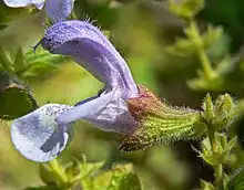 Salvia africana is a heavy branched aromatic perennial shrub native to the coast of the Cape Provinces of South Africa,[1] found on coastal dunes and in nearby rocky hills up to 600 m elevation. It grows to 60–90 cm, with round grayish stems covered with hairs that release a strong scent when brushed. The leaves are a soft grey-green, lighter on the underside, and elliptical shaped. The inflorescences reach 30 cm long, with 2-6 flowers in each whorl, ranging from pale blue to pale violet or pink.[2]