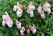Salvia caespitosa is a herbaceous perennial native to rocky limestone and volcanic slopes, at 4600–7900 ft elevation, in central and southern Anatolia. It has been grown in horticulture since the 1950s, typically in rock gardens, due to its dwarf, mat-growing habit. Caespitosa refers to its habit of "growing in dense clumps or tufts", with divided leaves and stems that grow in bunches, rather than being evenly spaced. The pale pinkish lilac flowers, about 1.6 in long, grow on very short inflorescences that are barely longer than the leaf.[1]